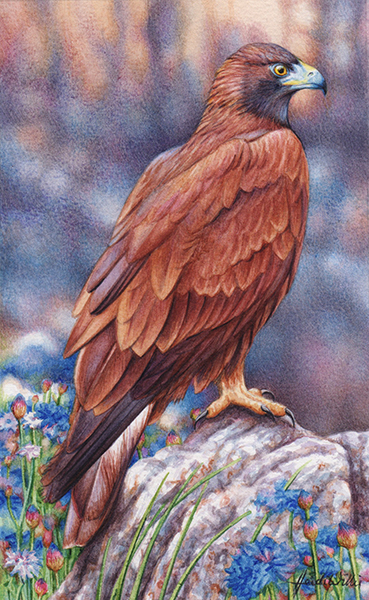 Raptor And cornflowers – miniature In Watercolour commission – sold