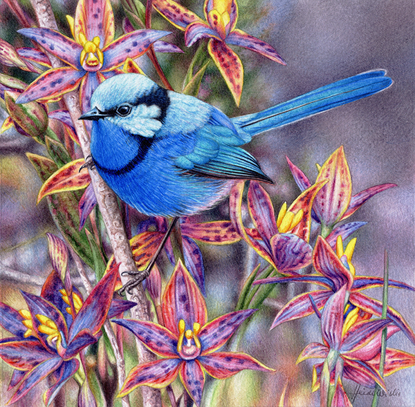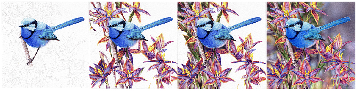 Here we see the Splendid Fairywren painting emerge in stages, from the initial bird study to receiving is fantastic orchid surrounds. Both the bird and the sun orchids are challenging subjects to paint, but I so enjoyed falling into its colours, textures, and intricacy. Now it is complete, its time to pack this little treasure up and send it off to join those that came before it, a beautiful collection indeed.