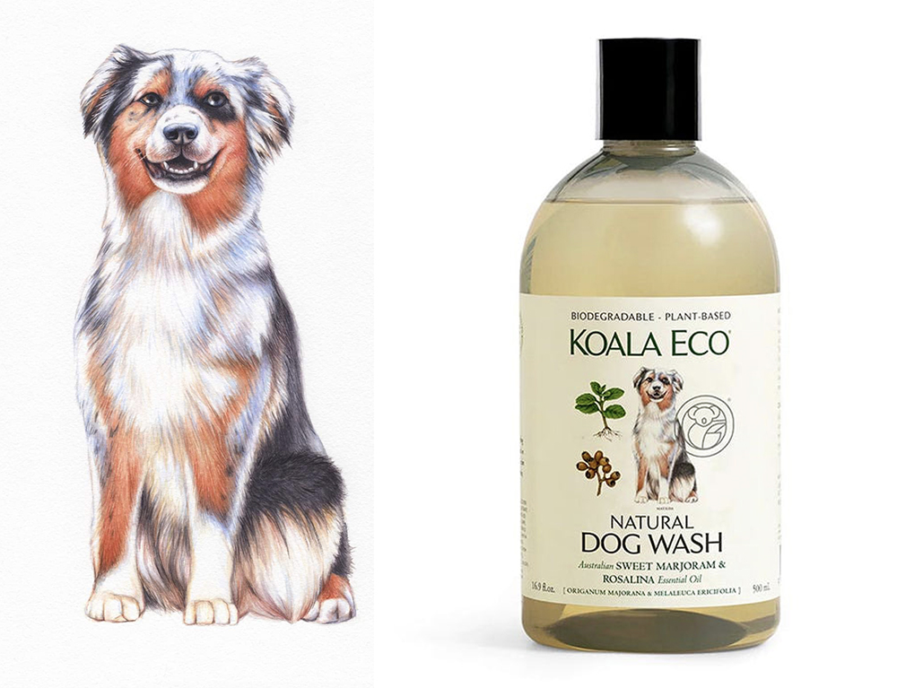 I am so thrilled to be working with this beautiful client again, and to be able to share the behind the scenes process of this project with you too. Wrapping up a huge project just 2 days ago, the timing of this one coming in to kick off the new week seemed impossibly perfect. I love that synchronicity as you well know by now. In the past I have worked with Koala Eco to create an illustration of their very own Australian Shepherd for their range, as they expanded their fab offerings into dog wash.
