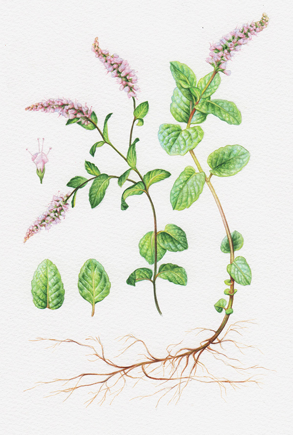 The first Im drawn to for some reason is a small, full plate botanical illustration of mint, including the roots and flowers of the plant in its composition. I love these almost ‘medicinal’ illustrations of plants. They always feel wonderful, mysterious and ancient as if magic and knowledge is somehow captured within its story. Mint is a common plant of course, and not the easiest to paint with its textural leaves and intricate flowers… especially so small, but I wasted no time, pulling up threads of mint from the garden to start observing it more closely, referencing and creating this illustration. With the drawing refined, its time for approvals and rendering.
