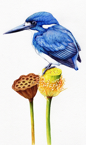 With the subjects decided, I began this piece with the kingfisher, then the lotus seed capsule as his resting perch. And, although my final version is not for copying, I have also created deep dive online painting lessons of both subjects to teach you all about this craft and the magic of realistic watercolour. Its a journey shared!