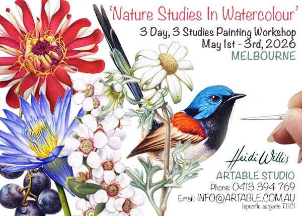 Announcing a brand new MELBOURNE painting workshop for you in May 2026, we have a 3 day event with 3 different subjects to learn from, delving into one realistic watercolour illustration and exercise a day. Each painting with its own learning points to enjoy, and after a little run of much big challenges over last seasons workshop offerings, its time to lighten up and enjoy a little change of pace. Though the specifics are yet to be decided, the illustrations in the image above are indicative of the kinds of topics we will work on, all being examples of past lessons. We will cover a small bird, a botanical and another natural history or nature element over our time together. Itll be fun!
