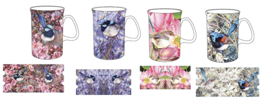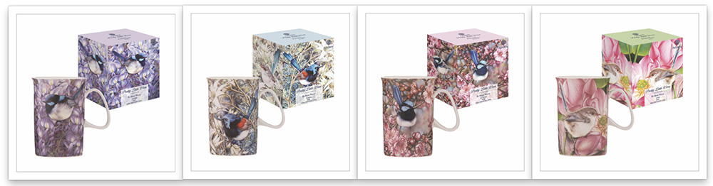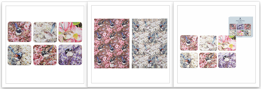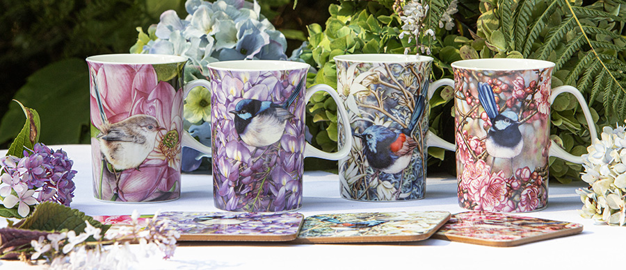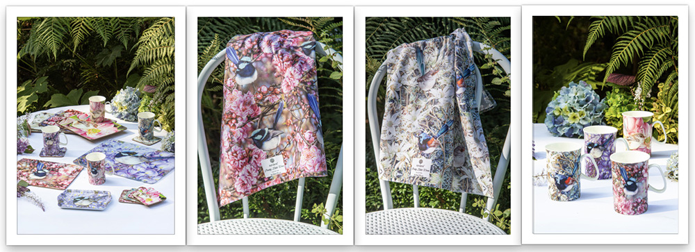 I’m thrilled to share a little behind-the-scenes look at one of my favourite projects with Ashdene, one of Australia’s leading homewares companies. Over the years, I’ve collaborated with Ashdene on a number of ranges, and this latest release features my 15 x 15 cm small bird studies in watercolour, of our beloved Australian wrens. Ashdene selected seven of my paintings for this project, six of which were combined into a connected landscape image for wrap around designs and merchandising. They also included the charming little Jenny Wren with the Lotus, bringing my studio work into a beautifully curated commercial collection.