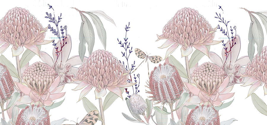 WARATAH ILLUSTRATION – This illustration is perhaps the piece that requires the most skill and experience to render as it is greatly adapted to parallel my clients original vision and balance of a concept. What was once a protea, the subject is now switched to an Australian flower of the waratah. Carefully, I designed this new painting subject to align as closely with the original look, feel and plan as possible. With the structure, flow and likeness recreated, my focus shifts to the next challenge of aligning the colour as well as i could. Switching the intense red of the waratah out for far more subtle pinks, yellows and greens, I alter the balance even further in the rendering stage to a completely new, refined story. A now delicately coloured yet striking waratah now takes the stage, completing the third illustration in the series.