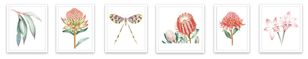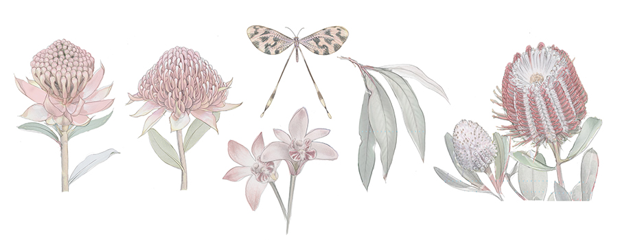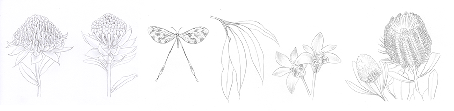 Ultimately I have a waratah in bloom, a waratah in bud, a scarlet banksia, a native orchid, a cluster of eucalyptus leaves and a spoonwing lacewing… my new favourite insect! What a gorgeous collection they make too. Next, I have to create and draw these elements to fit neatly into the template, designing and positioning each one in a way that aligns with the brief as precisely as possible. This is difficult to do again, as the ‘story’ of each subject is now changed with its own characteristics.