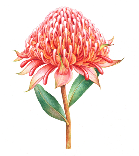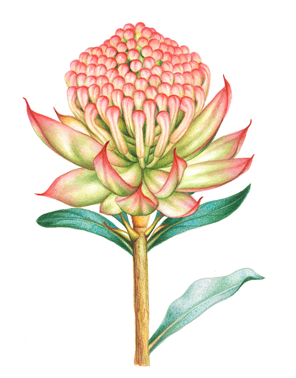 In the end we made one small change, with a simple addition of some lower stamens in one of the waratahas, bringing a little more flow to the balance, discussed red, green, pink and white at length (my favourite kind of discussions) and agreed to move forward without a hitch. With the roughs approved, its time to move on to the rendering stage where we create the finished illustrations for this project. My thoughts shift to refining, colour and styling now, so align the next stage as closely to my clients wishes as possible. Ill be simplifying the complexity of these studies with the application of the pigment, creating beautiful paintings that are simpler in colour use, detail, depth and technique… thats not to say its easier to do! So now Ill step away for a moment to create the refined drawings, taking the project to the next stage.