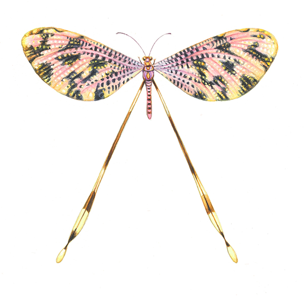 SPOONWING LACEWING ILLUSTRATION –Starting this series of botanical illustrations and the most divine Spoonwing Lacewing study, I decided to start with insect illustration first. There was no reason at all why, other than I just couldnt wait! I was dying to play with this incredibly beautiful insect painting, with its wings of apricot, pink and mauve, markings of black and those incredibly elegant tails that stream away from its delicate body… so i jumped right in.